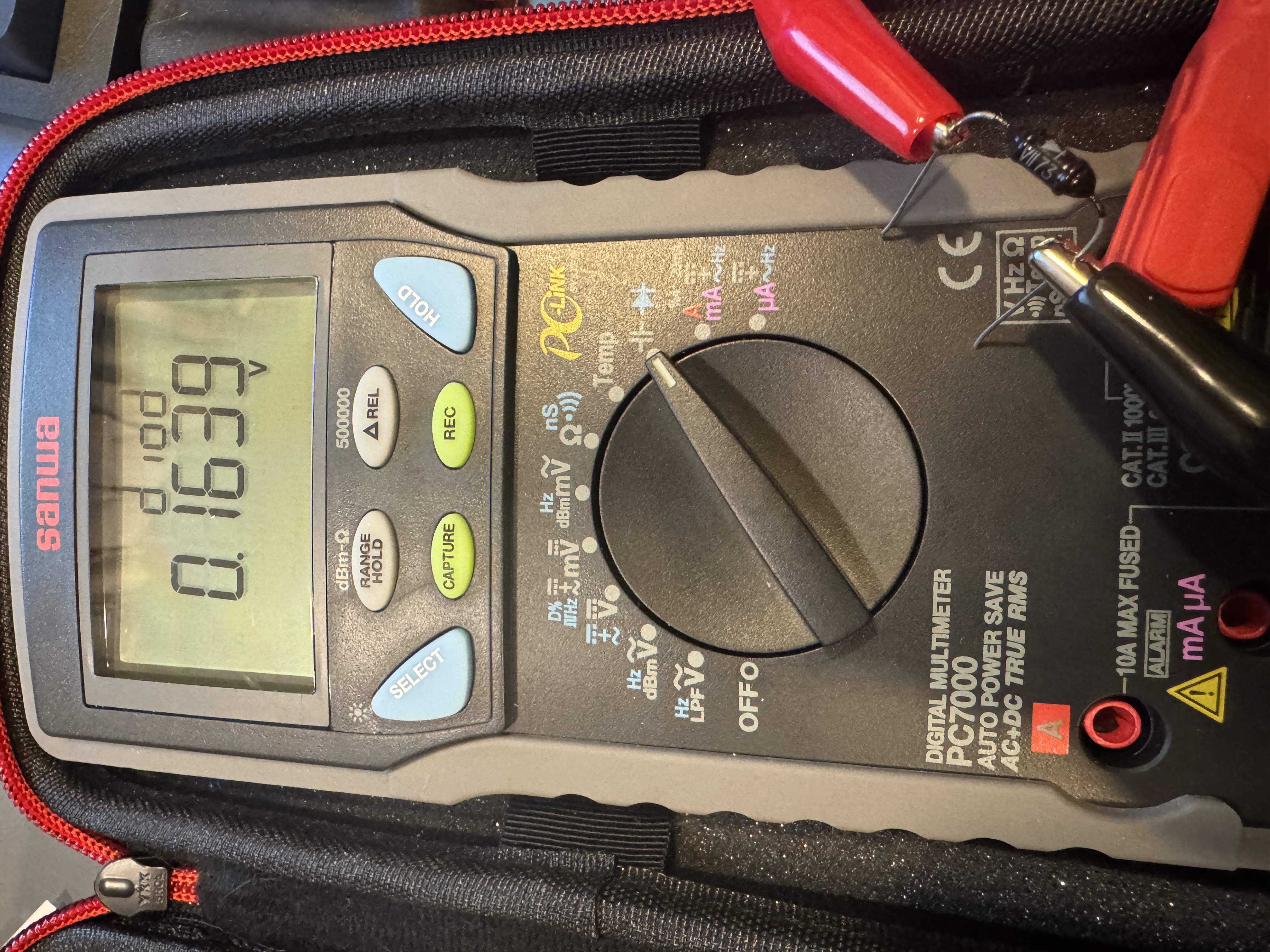 SANWAのテスターで測ったら、0.1V強だった。かかる電圧でVfが変化するのかな。