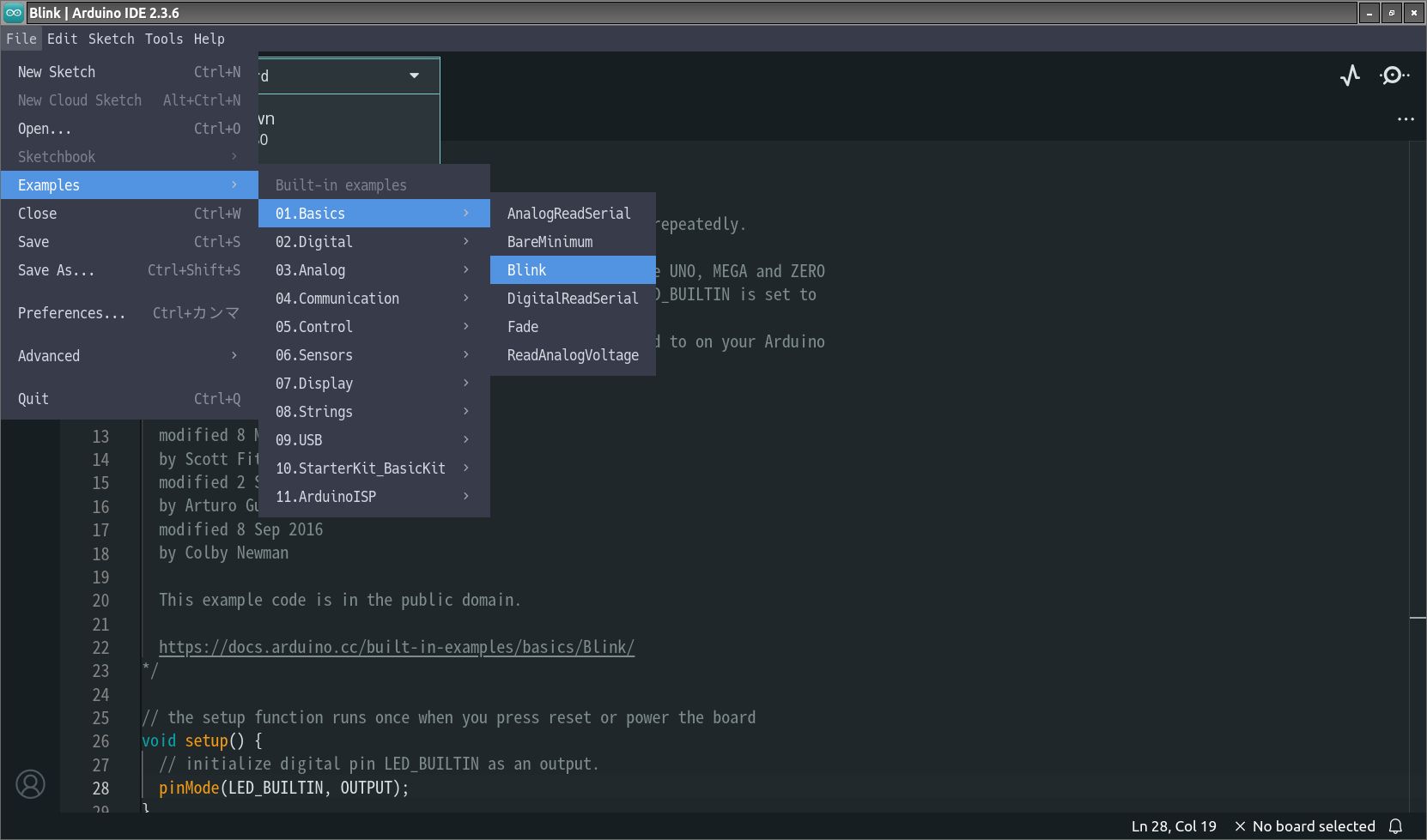 File → Examples → 01.Basics → Blinkを開く。