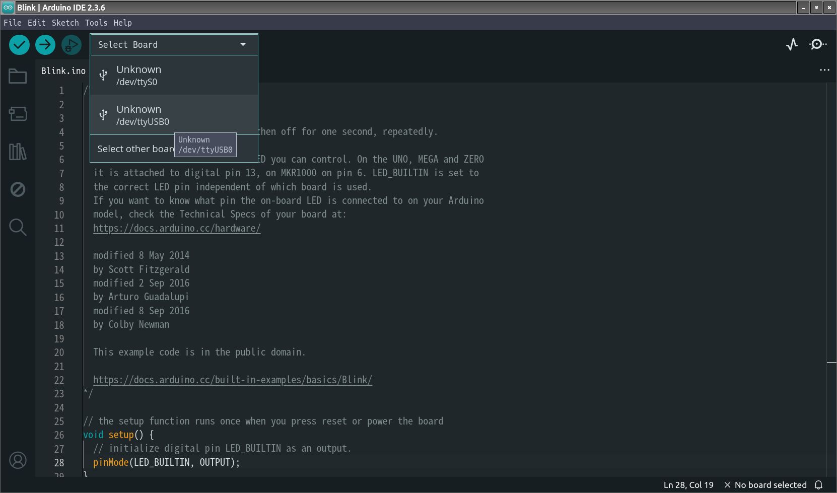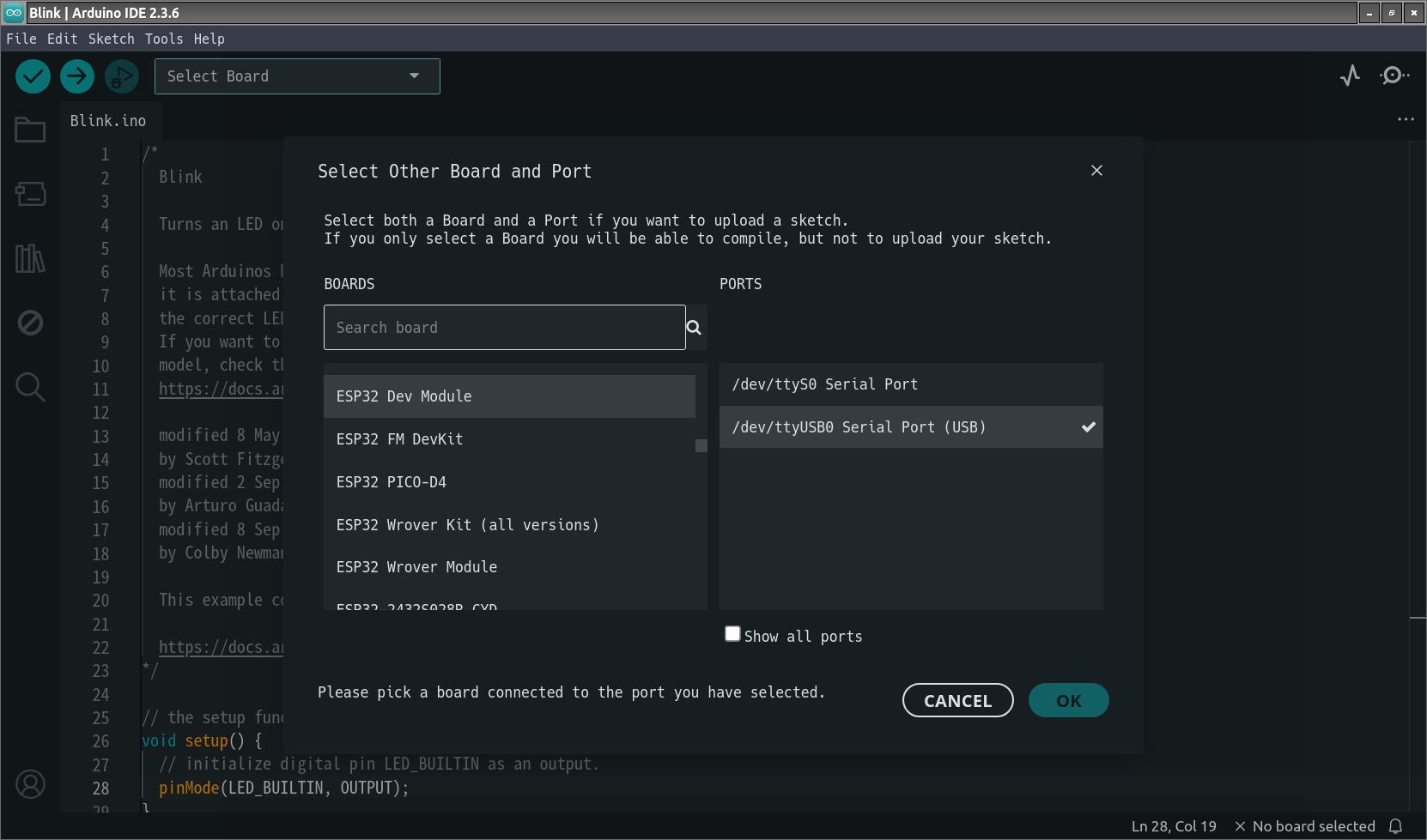 Select BoardからttyUSB0を選ぶ。