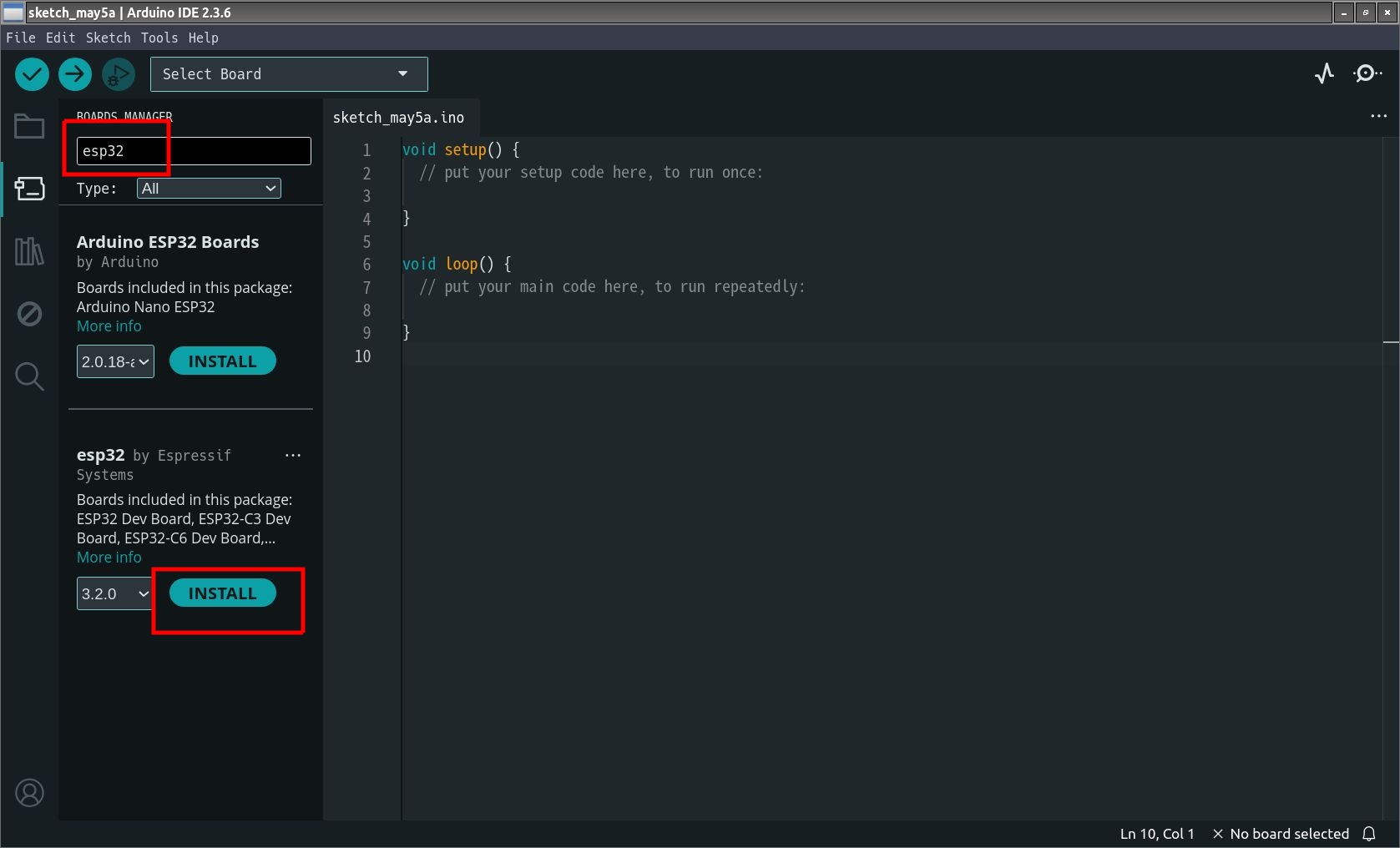 "esp32"と入力して esp32 by EspressifをINSTALL