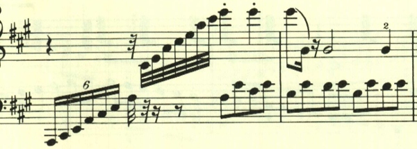 次は、もう少し速くなる。ここは最初の部分が16分音符の6連符になっているが、長さ的には8分音符の6連符の間違いだと思われる。