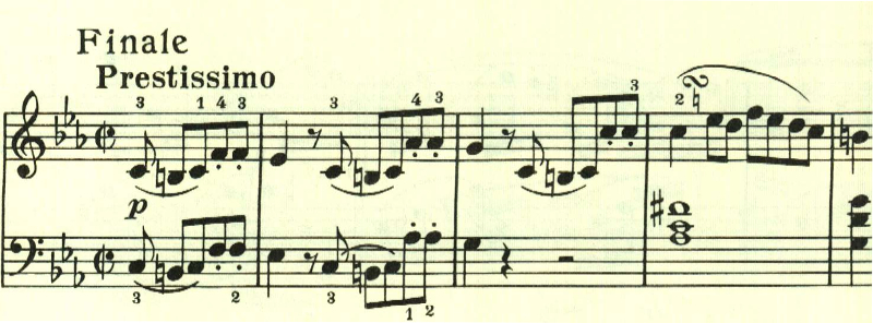 終楽章は、様々なダイナミックな変化が試されている印象的な傑作。リズム、速さの変化、音量の変化と全てが印象的な傑作。曲は最初はハ短調の不気味で靜かなテーマで始まる。