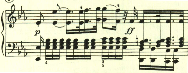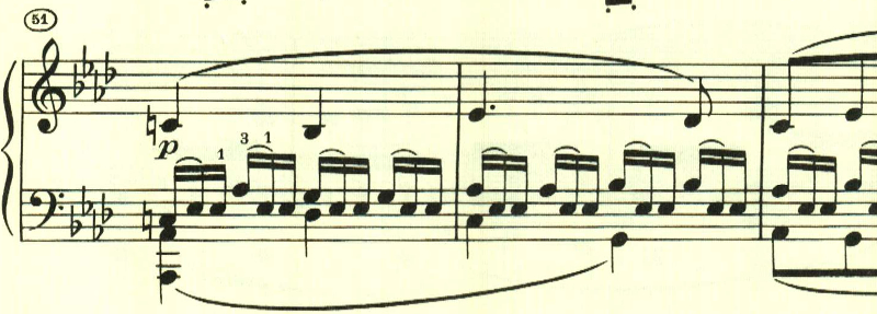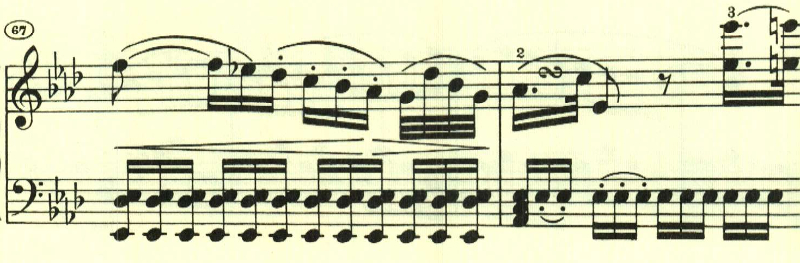 序奏が終わり、左手のトレモロの上に、最初のテーマが現れる。ここはpで音量を抑えていることが絶大な効果を上げている。