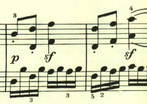再度最初のテーマが繰り返される。最後は、8分音符分のずれを伴って劇的に終わる。