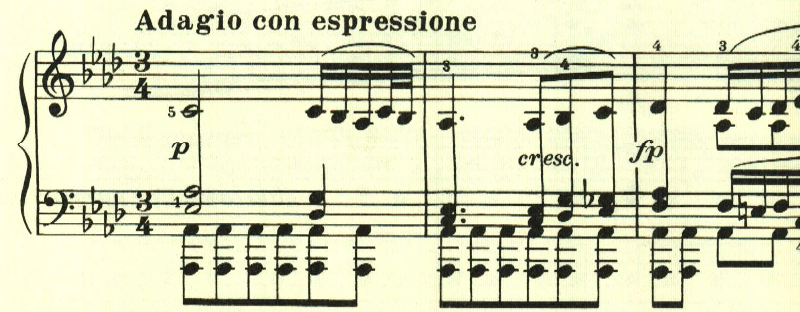 ここから「幻想曲風ソナタ(SONATA QUASI UNA FANTASIA)」というタイトルが付くようになる。 霧の中をゆっくり進むような、和音を主としたテーマで始まる。