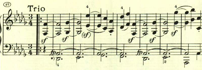 トリオも長調で、あまり雰囲気は変わらないが、後半はやるせないよう諦めているような感じのテーマとなる。da capoで戻って最初のテーマが繰り返されて終わる。