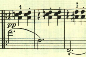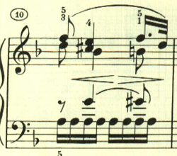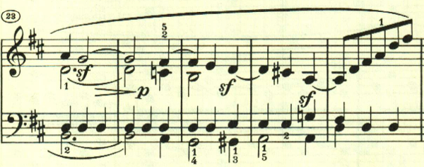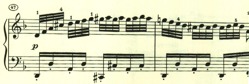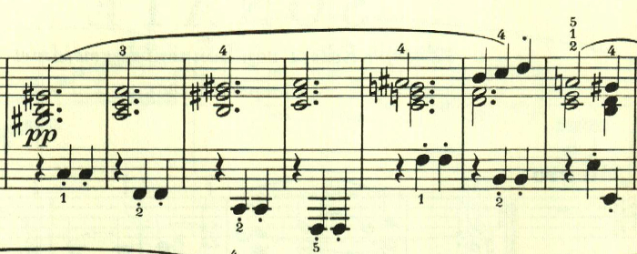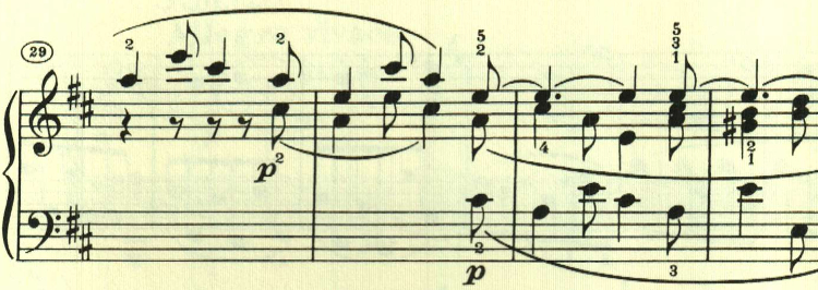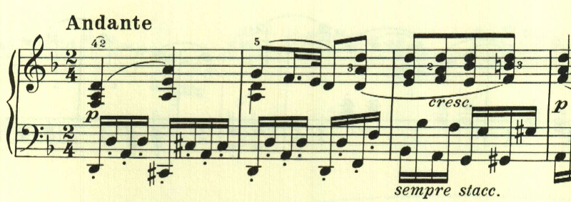 15番では4楽章に戻っており、第2楽章はスタカートの左手の上に憂鬱なテーマが進む。
