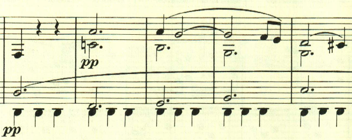 特徴的な2つ目のテーマは最初は幻想的な雰囲気の中に浮かび上がるかのようで、メロディーらしきものが見当たらない。