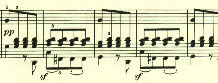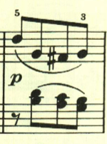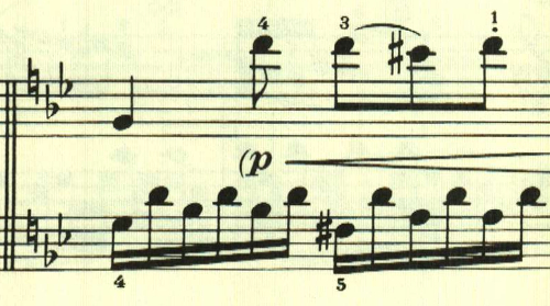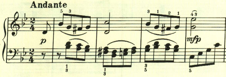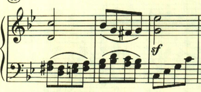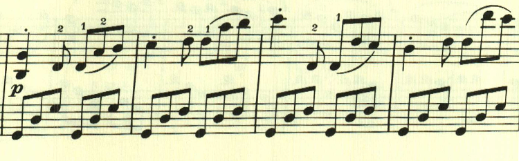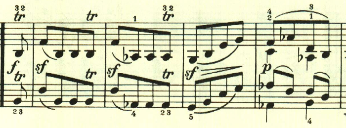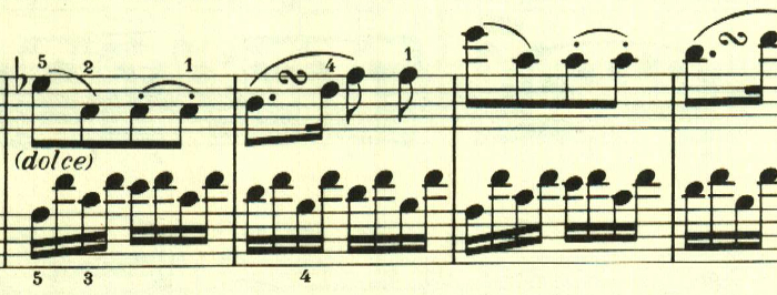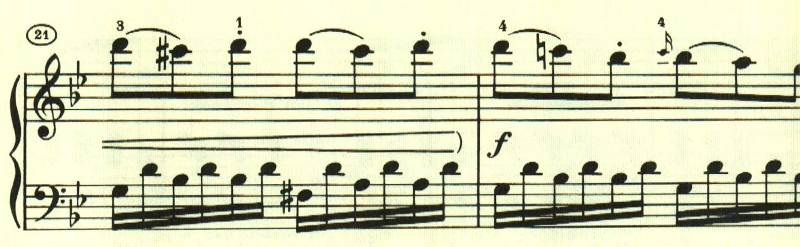 展開部。意表をついて2つ目のテーマの出だしが展開される。