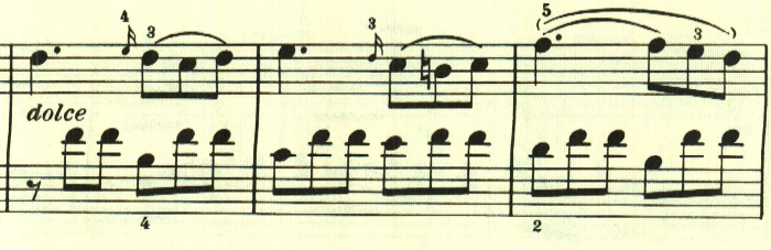 ここは同じ音型で、スラーの位置が変わり長調となる。