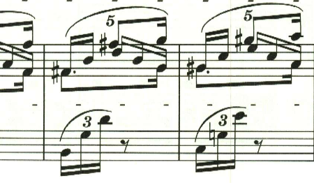 この曲は、一部だけ5連符へと微妙にリズムが変更されていて、ここも謎かけになっている。こちらは中声部の開始点がずれていないので、計算上、問題無いのだが、逆に他の部分はどういうわけなのだ、という感じ。色々とずれているものを、うまくまとめてみろというショパンからの挑戦状なのだろうか。