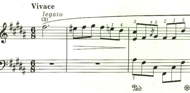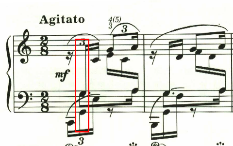右手は広い音域をおさえなければならないので、親指で2つの音を弾くように指定されている。そしてクレシェンドが指定されているが、スラーの最後の音なので音量は抑える必要があり、ここは音を揃えて弾くのが難しい。