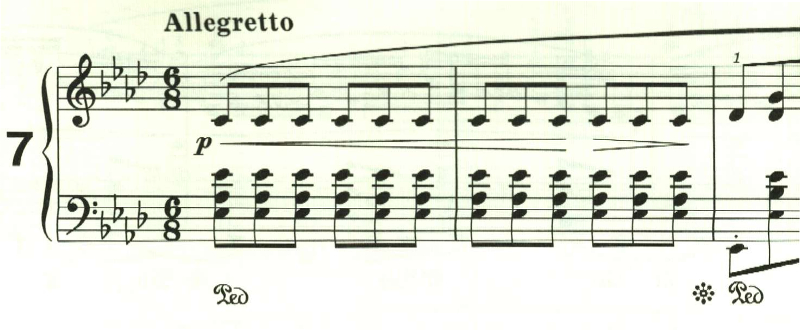 曲は3部で構成され、中間部は短調になるが、同じ音が繰り返されるのは変わらない。